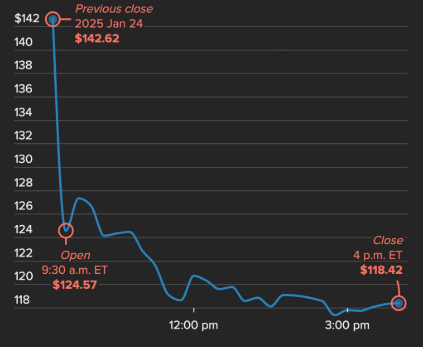 On Monday, Nvidia’s stock price fell sharply, dropping 17% in a single day. This caused the company’s market value to shrink by nearly $600 billion, marking the biggest one-day loss for any U.S. company in history.